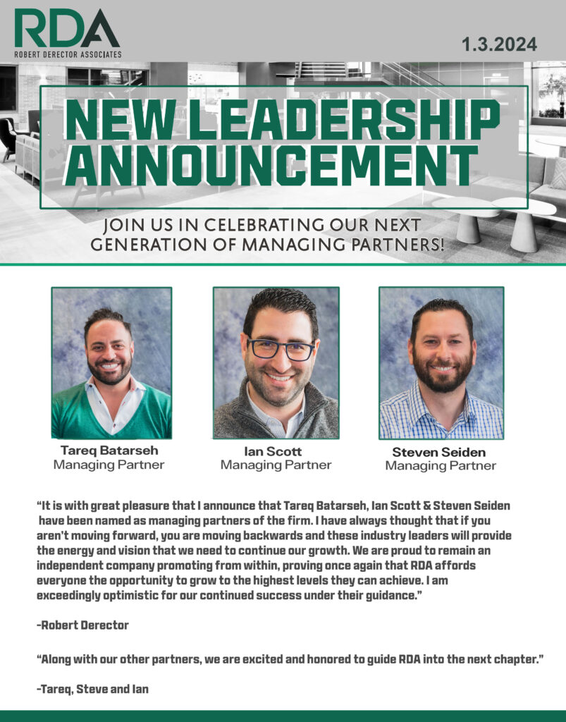 It is with great pleasure that I announce Tareq Batarseh, Ian Scott & Steven Seiden have been named as managing partners of the firm. I have always thought that if you aren’t moving forward, you are moving backwards and these industry leaders will provide the energy and vision that we need to continue our growth. We are proud to remain an independent company promoting from within, proving once again that RDA affords everyone the opportunity to grow to the highest levels they can achieve. I am exceedingly optimistic for our continued success under their guidance.”